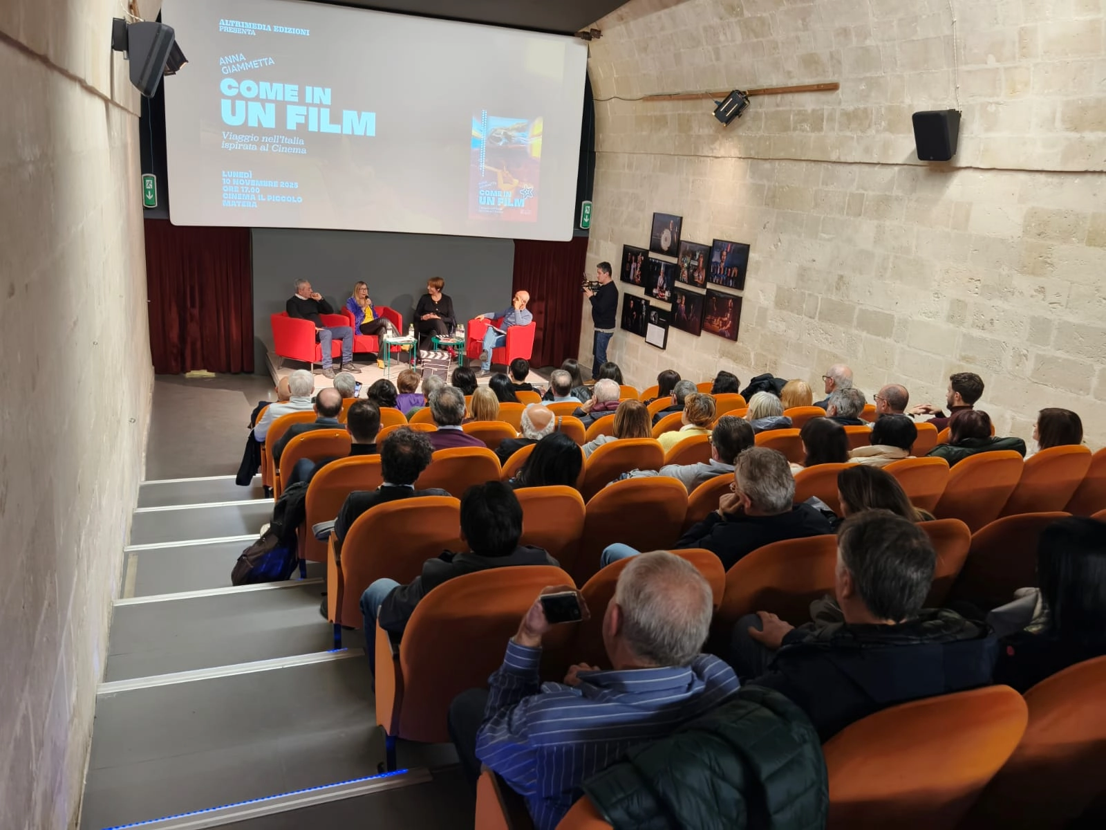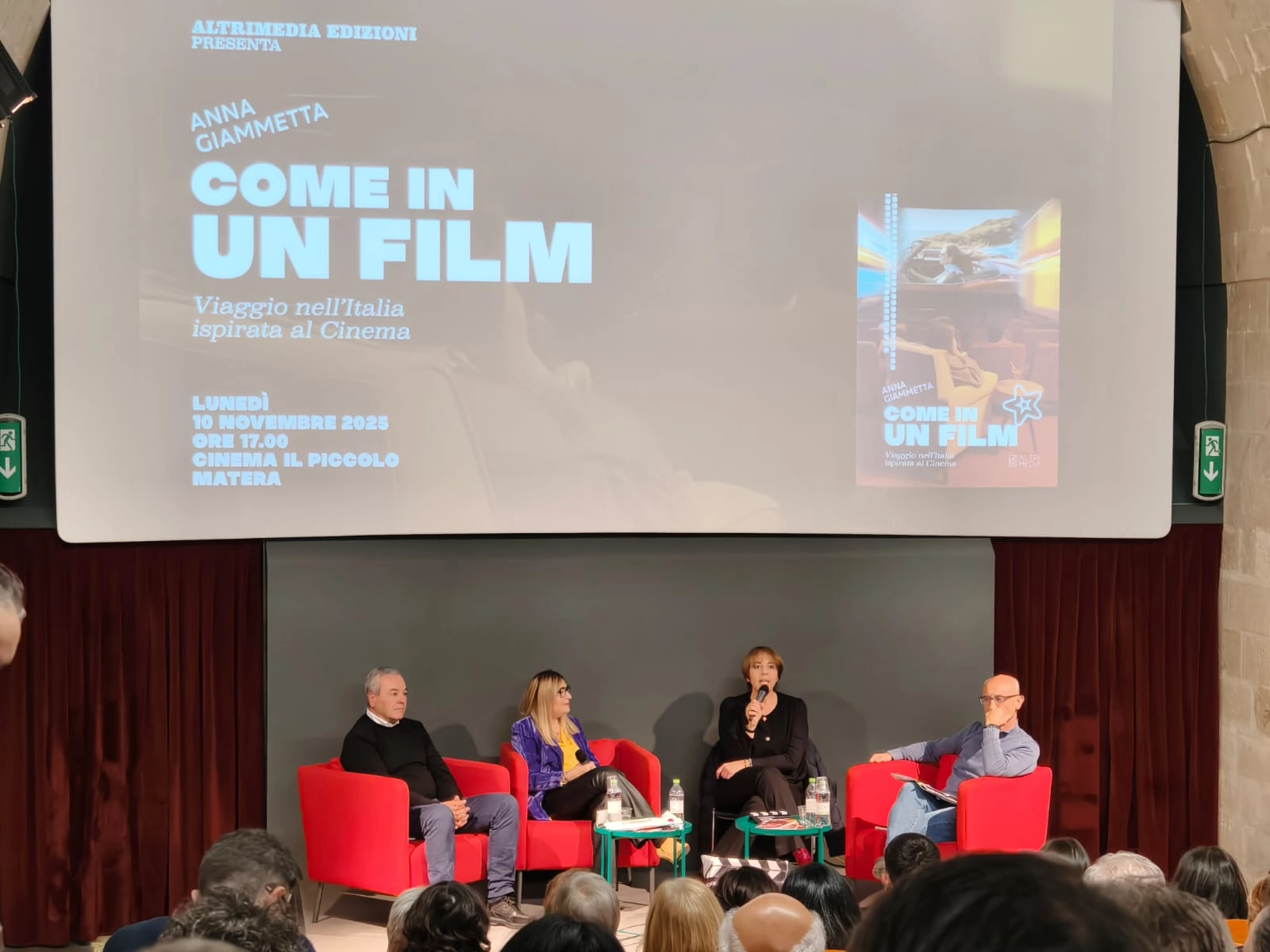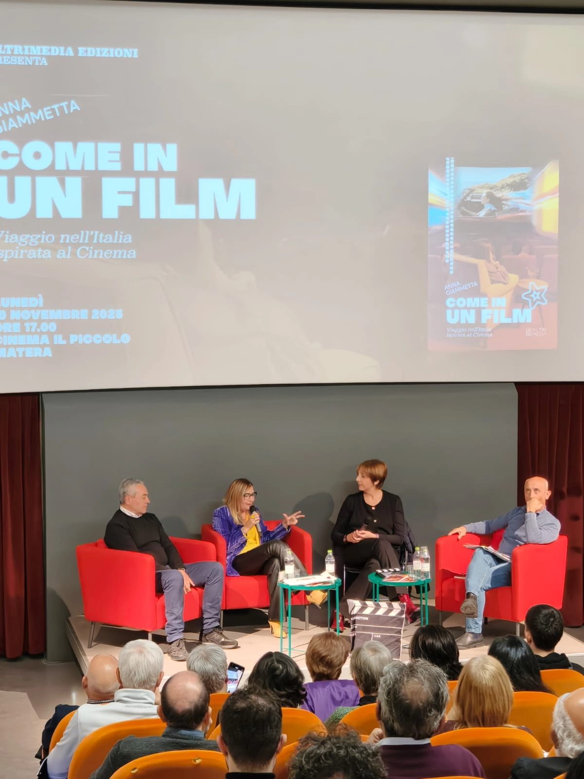 “Come in un film” di Anna Giammetta, presentato ieri 10 novembre al Cinema Il Piccolo di Matera, ha conquistato il pubblico accorso numeroso. Insieme ai giornalisti Vito Bubbico e Franco Martina (Giornalemio.it), Gabriella Lanzillotta ha moderato la serata dialogando con l’autrice sui numerosi temi presenti nel libro. Dai titoli dei film, alle città location di successo, passando per la gastronomia dedicata al cinema e alle numerose curiosità che popolano il racconto del libro. Non sono mancati amarcord suggestivi che hanno regalato al pubblico memorie personali, come quella di una “piccola e giovane autrice coinvolta, a sua insaputa, nelle riprese del film Cristo si è fermato a Eboli mentre si recava con la famiglia a un funerale a Craco”, scena di vita vera presa in prestito dal cinema per trasmettere al pubblico quel realismo, lucido e opaco al tempo stesso, di cui il regista Francesco Rosi è stato espressione geniale. La serata si è arricchita di incursioni nel mondo delle fiction, da Imma Tataranni Sostituto Procuratore a Lolita Lobosco, accarezzando quelle città, Matera e Bari, che hanno accolto queste donne con la cura e la dedizione che si riserva ai progetti importanti. Anna Giammetta ha svelato come le sue passioni per la scrittura, i viaggi e il cinema l’abbiano condotta, quasi senza volere, alle pagine divenute poi una piccola guida itinerante per attraversare l’Italia ispirata al cinema. Non sono mancati i numerosi plausi ai talenti e ai professionisti che in questi anni il territorio ha espresso e continua a esprimere nell’ambito del cinema (registi, attori, direttori e organizzatori di festival, esperti in cineturismo…) A breve nuove presentazioni a Matera e in giro per la provincia continueranno a muovere domande e suscitare interesse per quello che sta dimostrando essere una piccola cassetta degli attrezzi per chi il cinema ama attraversarlo come un universo multiverso. (Foto @Michele Morelli)