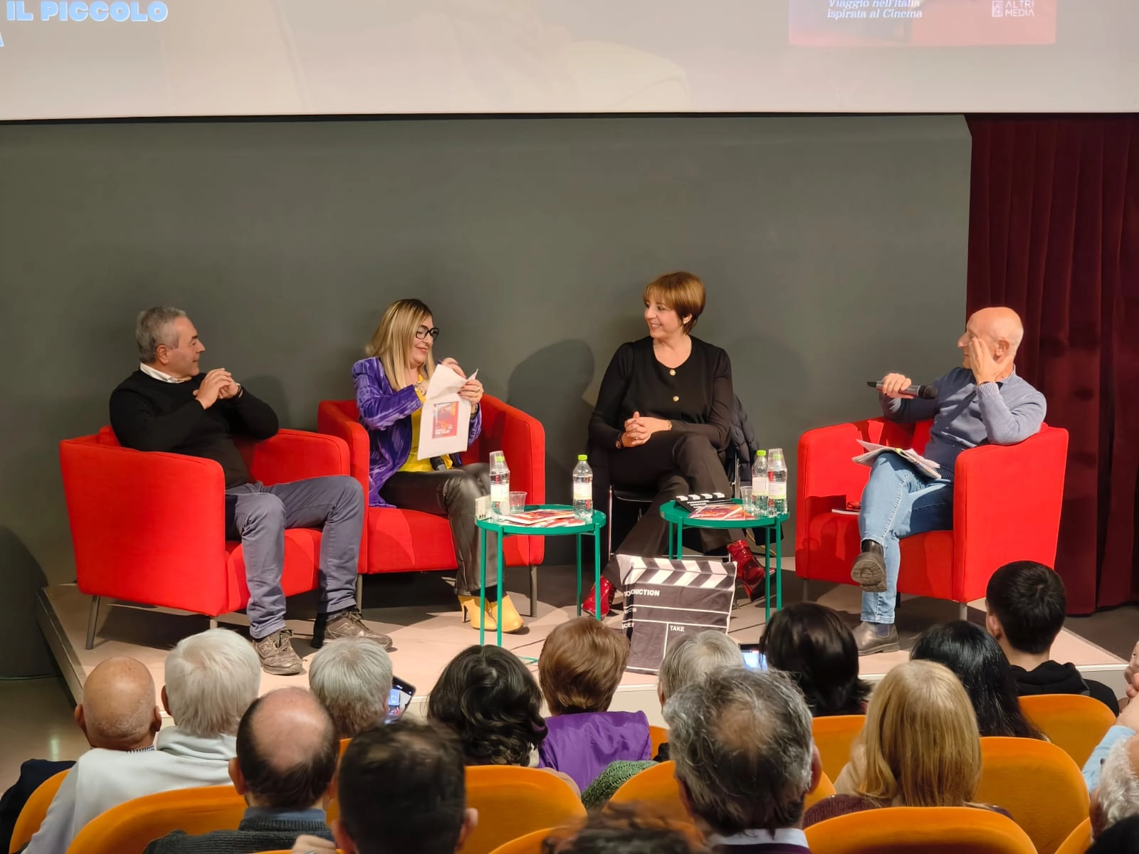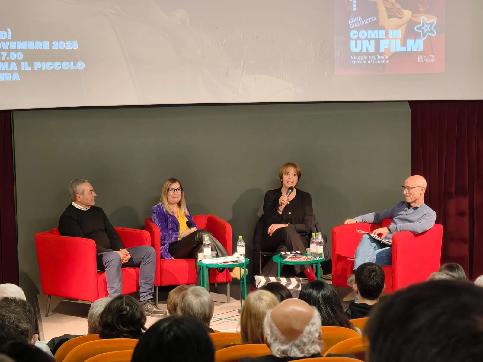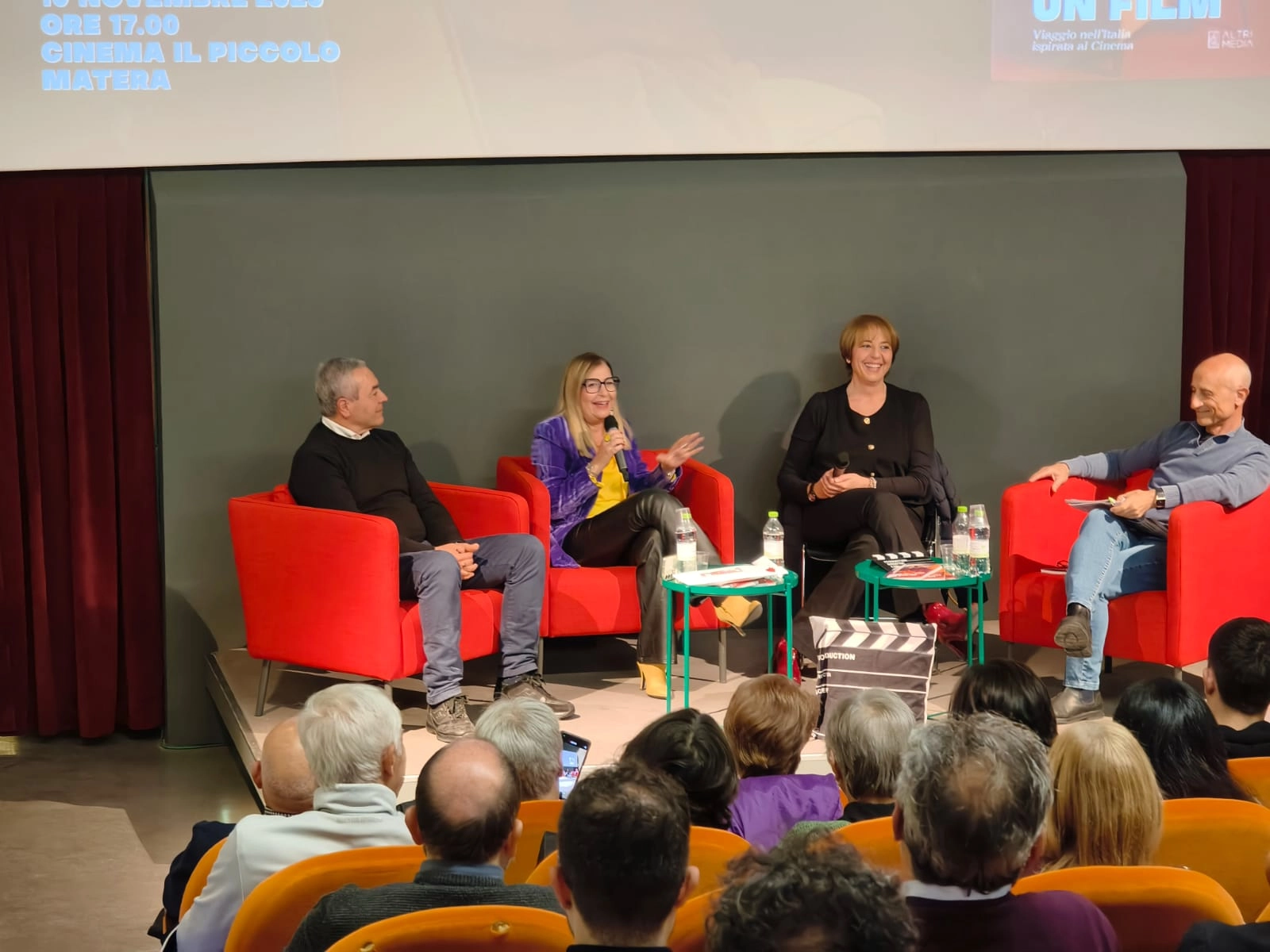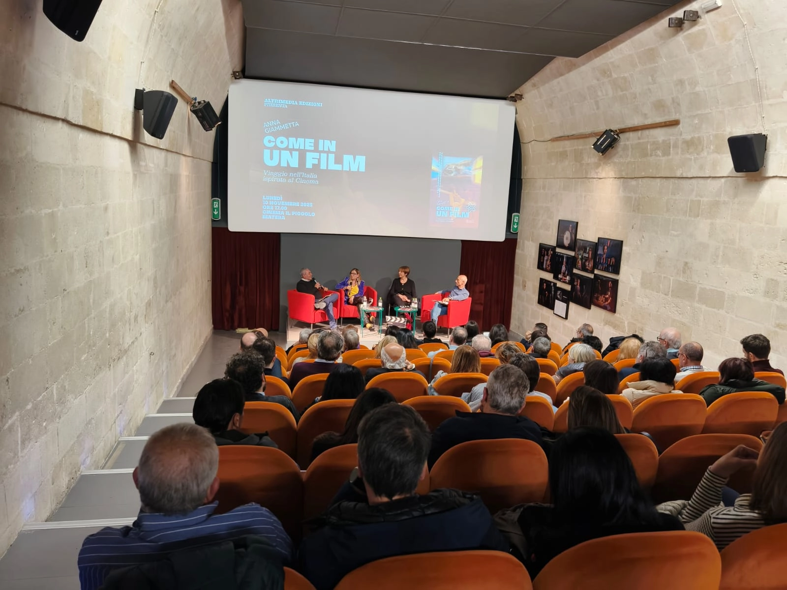“Come in un film” di Anna Giammetta, presentato ieri 10 novembre al Cinema Il Piccolo di Matera, ha conquistato il pubblico accorso numeroso. Insieme ai giornalisti Vito Bubbico e Franco Martina (Giornalemio.it), Gabriella Lanzillotta ha moderato la serata dialogando con l’autrice sui numerosi temi presenti nel libro. Dai titoli dei film, alle città location di successo, passando per la gastronomia dedicata al cinema e alle numerose curiosità che popolano il racconto del libro. Non sono mancati amarcord suggestivi che hanno regalato al pubblico memorie personali, come quella di una “piccola e giovane autrice coinvolta, a sua insaputa, nelle riprese del film Cristo si è fermato a Eboli mentre si recava con la famiglia a un funerale a Craco”, scena di vita vera presa in prestito dal cinema per trasmettere al pubblico quel realismo, lucido e opaco al tempo stesso, di cui il regista Francesco Rosi è stato espressione geniale. La serata si è arricchita di incursioni nel mondo delle fiction, da Imma Tataranni Sostituto Procuratore a Lolita Lobosco, accarezzando quelle città, Matera e Bari, che hanno accolto queste donne con la cura e la dedizione che si riserva ai progetti importanti. Anna Giammetta ha svelato come le sue passioni per la scrittura, i viaggi e il cinema l’abbiano condotta, quasi senza volere, alle pagine divenute poi una piccola guida itinerante per attraversare l’Italia ispirata al cinema. Non sono mancati i numerosi plausi ai talenti e ai professionisti che in questi anni il territorio ha espresso e continua a esprimere nell’ambito del cinema (registi, attori, direttori e organizzatori di festival, esperti in cineturismo…) A breve nuove presentazioni a Matera e in giro per la provincia continueranno a muovere domande e suscitare interesse per quello che sta dimostrando essere una piccola cassetta degli attrezzi per chi il cinema ama attraversarlo come un universo multiverso. (Foto @Michele Morelli)